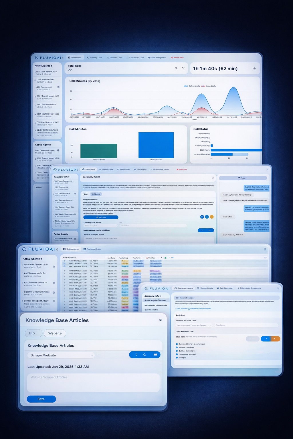 FluvioAI’s Agent Management Console gives you deep, real control over every aspect of your conversational AI agents. It’s far more than a static dashboard — it’s a comprehensive command center that puts you in the driver’s seat of training, deployment, performance monitoring, and workflow configuration. Whether you’re fine-tuning outbound logic, adjusting inbound call flows, or reviewing analytics, the console empowers teams to iterate quickly and confidently without needing engineering support.
